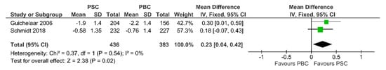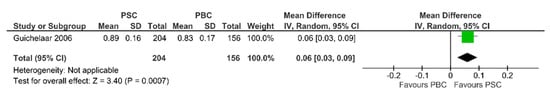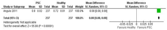 Figure 5. Forest plot assuming a fixed-effects model for Z-score PSC vs. PBC [30,33].