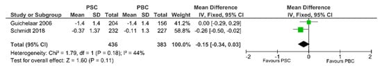 Figure 4. Forest plot assuming a fixed-effects model for T-score PSC vs. PBC [30,33].