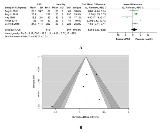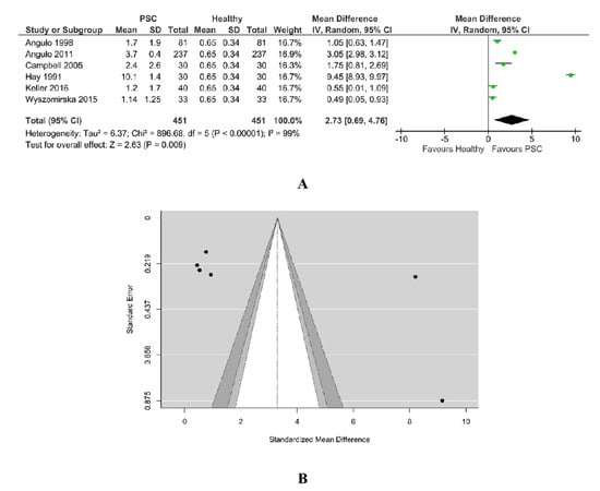 Figure 9. (A) Forest plot assuming a random-effects model for bilirubin PSC vs. Healthy. (B) Funnel plot for publication bias assessment for bilirubin in PSC patients vs. Healthy [18,19,29,31,32,34].