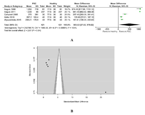 A total of five studies were included in this analysis, as in Figure 10A. The pooled data revealed a significantly higher value of alkaline phosphatase for PSC patients than for healthy ones. According to the Q-test (Tau2 = 292798.79, Q = 796.386, Chi2 = 1580.88, p < 0.00001, I2 = 100%), the studies are heterogenous and the random-effects model was used. An examination of the studentized residuals revealed that Angulo et al. may be a potential outlier in the context of this model.