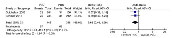 Two studies inspected the effects of PSC compared with PBC on fractures, including 442 PSC patients and 398 PBC patients. We observed low heterogeneity between the studies (Chi2 = 0.01, p-value = 0.92, I2 = 0%). Pooling the results with a fixed-effects model, as in Figure 11, the tendency was to report less fracture events in PSC patients than in PBC patients (OR = 0.68, 95% CI 0.46 to 1.00, p-value = 0.05).