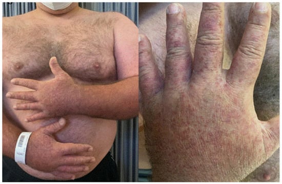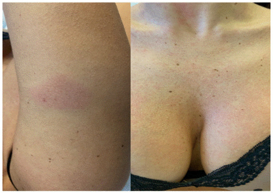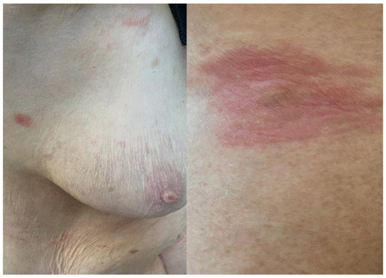 Since COVID-19 vaccines were introduced to the market, several reports have documented a high number of adverse reactions, with more frequently described symptoms such as fever, myalgia, headache and recurrence of chronic inflammatory diseases. Indeed, COVID-19 vaccines are able to induce a strong inflammatory reaction with the release of Th1 cytokines, which are typically over-expressed in certain pathologies such as in psoriasis, vitiligo and lichen planus [1]. A careful analysis of the reported cases of severe allergic reaction to vaccines has shown that they are very rare and mostly related to certain ingredients, such as polyethylene glycol and polysorbate, which are used as excipients [3]. The most frequently reported cutaneous manifestations that present after more than 24 h after the vaccine include the “COVID arm”, or the onset of sometimes erythematous, painful patches, located at the injection site; urticaria-like skin reactions; exanthema-like eruptions, erythema multiforme, erythematous lesions in the lower limbs, pityriasis rosea, lymphomatoid drug reactions and flare up of psoriasis [1,4,5,6]. Herein, we aim to describe cases of patients referred to our outpatient clinic with cutaneous manifestations following COVID-19 vaccination.