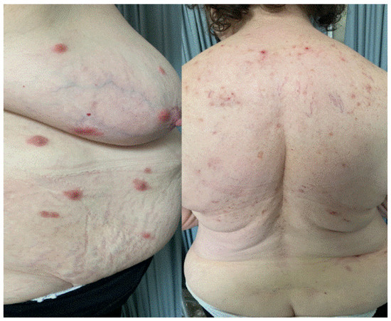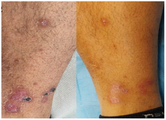 Sweet syndrome or acute neutrophilic dermatosis, instead, is a disorder characterized by rapid onset of fever accompanied by erythematous–violaceous popular–nodular lesions, which are localized on the head and neck region and on the trunk [11]. More frequently found in women, several causative agents are recognized in its background, such as recent infections, several drugs, or neoplasms, in particular hematological disorders [11].