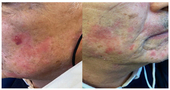 A 67-year-old man was complaining of facial skin lesions one week after Pfizer-BioNTech booster vaccination. We observed that scaly and atrophic erythematous plaques developed on both cheeks. His medical history was positive for cutaneous lupus erythematosus of the face, and therefore, he refused to undergo skin biopsy. Based on the clinical aspect, we hypothesized a reactivation of cutaneous lupus after vaccination. The 0.1% tacrolimus topical therapy resulted in an improvement of the face cutaneous lesions. (Figure 7).