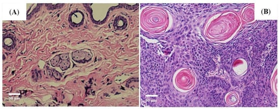 Histological staining of mice exposed to UVR. (A) Normal skin; (B) cSCC.
