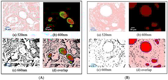 Single-band images of stained sections of normal and cancerous tissues (scale bar 50 µm). (A) cSCC tissue; (B) normal skin tissue; (a) Image at 520 nm spectral bands; (b) Image at 600 nm spectral bands; (c) Image at 660 nm spectral bands; (d) mixed imaging.