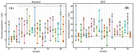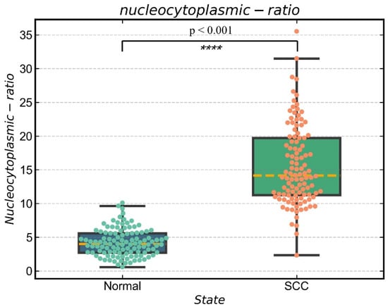 Values of nucleocytoplasmic ratio were expressed as average, maximum and minimum. Comparisons between two groups were performed using Student’s t-tests; **** p < 0.05.