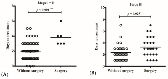 The only operated Chandler I case and the five operated Chandler II cases all started intravenous antibiotic therapy more than three days from symptom onset, whereas non-operated cases started intravenous antibiotic therapy less than two days from symptom onset (p < 0.001) (A). Non-operated Chandler III cases had intravenous antibiotic therapy (2.34 ± 1.40 days) earlier than those with surgical intervention (3.27 ± 1.66 days) (p = 0.025) (B). * p < 0.05; *** p < 0.001.