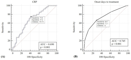 ROC curves were generated, and the AUC was calculated to evaluate the sensitivity and specificity of the CRP value and the interval of initiating intravenous antibiotics from symptom onset in detecting patients who require surgical intervention. A CRP value of >55.73 mg/L and initiating intravenous antibiotics >2 days from the onset of periorbital swelling showed the best predictive power for the necessity of surgical drainage (sensitivity = 0.75 and 0.67, specificity = 0.57 and 0.72, respectively); the respective AUCs were 0.69 and 0.75 (p < 0.001) (Figure 2). On the other hand, twenty-eight of twenty-nine (96.6%) children who met both criteria of a CRP value <55.73 mg/L and the initiation of intravenous antibiotics <2 days were successfully treated medically, without requiring surgical intervention.