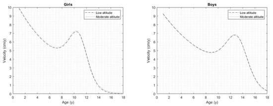 Regarding the PHV, this study demonstrates that the boys reached a higher growth velocity, which was 6.85 ± 0.55 cm/y, whereas, in the girls, it was 6.55 ± 0.54 cm/y, suggesting that Colombian girls and boys living at both altitudes differed in their PHV. These velocity patterns were less accelerated than similar patterns from children and adolescents living at moderate altitudes in Colombia (7.43 ± 0.42 cm/y in boys and 7.00 ± 0.19 cm/y in girls) [16]. However, our data were similar to those reported from Yopal (Colombia), which demonstrated 6.96 years in boys and 6.57 years in girls [22].
