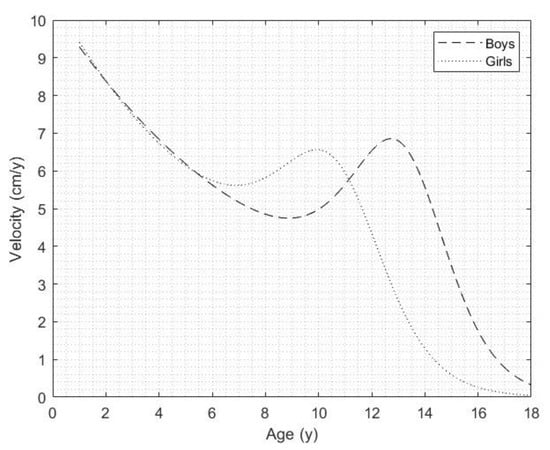 The variability of growth velocities can be investigated by constructing growth-velocity curves and estimating the mathematical and biological parameters, using mathematical models, which allows the gathering of information on timing and tempo [8]. In this context, the age of the peak height velocity (APHV) (years) and the peak height velocity (PHV) (cm/years) are the non-invasive biological parameters that can be estimated through the mathematical model of Preece and Baines [9]. This model belongs to a family of curves that fit the shape of the human growth curve. In fact, several recent studies have focused on modeling linear physical growth with cross-sectional data from children and adolescents living in various regions of the world [3,5,10].