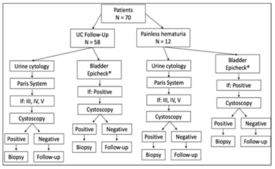 This is a prospective and descriptive cohort study conducted on patients with non-muscle invasive urothelial carcinoma under oncological and urological follow-up at the Urology and Medical Oncology Service of the South Catalonia Oncology Institute (Hospital Universitari de Sant Joan, Reus, Spain), between 1 January 2018 and 31 March 2022. Patients with painless hematuria and Paris system category III, IV, and V, with no histopathological diagnosis were also included (Figure 1). We studied urine samples that 70 patients had submitted to the molecular pathology unit of our pathology department. The patients’ clinical data were extracted from medical records and the study was approved by the Institutional Review Board (IISPV). Two urine samples were obtained from each patient simultaneously, one of which was processed for cytological study and the other for DNA methylation study. At the time of evaluating the results of both the cytology study and the methylation test, none of the investigators responsible for the analyses were aware of the results of the tests.