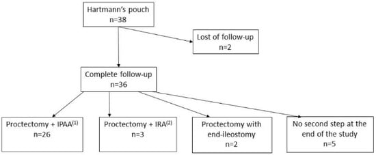 Two patients were lost at follow-up. Out of 36 remaining patients, intestinal continuity was restored in 29 patients (76.3%), after a median duration of 4.1 months (2.3). Twenty-six patients (68.4%) underwent proctectomy with IPAA, and three patients (7.9%) underwent ileorectal anastomosis without stoma. Two patients (5.3%) underwent proctectomy with definitive end ileostomy, where one patient was a 70-year-old man who preferred no further surgery beyond ileostomy, while the other patient had a BMI > 30 kg/m2, which made it technically impossible to perform IPAA. Nine patients (23.7%) did not undergo a second surgical step; general anesthesia was contra-indicated in one patient, while eight refused further surgery (Figure 1).