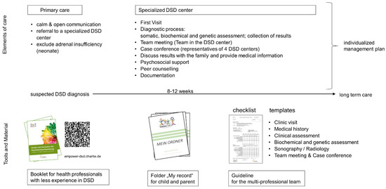 In Germany, several specialized DSD centers offer a patient/family-centered care by a multidisciplinary team, according to the current recommendations [7,8]. The interdisciplinary team organizes diagnostic procedures, psychosocial support, and transparent information concerning the child and their parents. So far, this information and care process for children and youth with newly diagnosed DSD, which might be associated with genital variation or questions of gender assignment, has not been standardized in Germany.