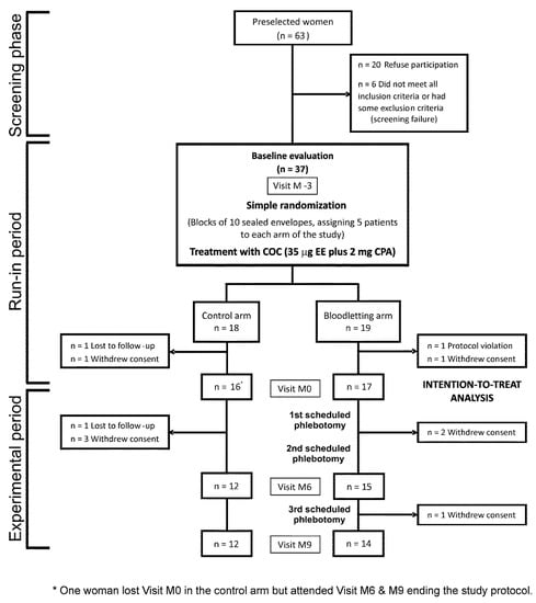 After randomization (month −3 visit), participants started a run-in period of treatment with a COC [21 pills containing 35 μg of EE plus 2 mg of cyproterone acetate (CPA) followed by 7 placebo pills, Diane35 Diario; Schering España S.A., Madrid, Spain]. After 3 cycles of treatment (month 0 visit), the bloodletting intervention began in the experimental arm, consisting of 3 scheduled phlebotomies during a 9-month period, with study visits at months 6 and 9 (end of the study) (Figure 1). Participants in both arms of the RCT maintained their treatment with COC throughout all study visits.