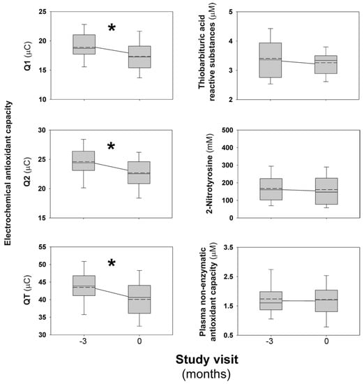We directly measured electrochemical antioxidant capacity in 60 mL of plasma at room temperature. This measurement was based on the redox potential readings obtained from a potentiostat (e-BQC lab, BIOQUOCHEM S.L., Llanera-Asturias, Spain), and expressed in charge units [micro-Coulombs (μC)]. Electrochemical antioxidant capacity represents the charge of the electrons released by the antioxidants present in plasma to neutralize free radicals. This device distinguishes between compounds of high (Q1) or low rate (Q2) of free radical scavenging and also reports the sum of both (QT), with an inter-assay coefficient of variation (CV) of 8%.