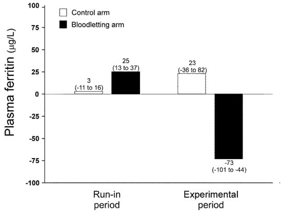 Changes in circulating ferritin in each arm of the trial throughout the study. Data are shown as mean of the differences and 95% CI.