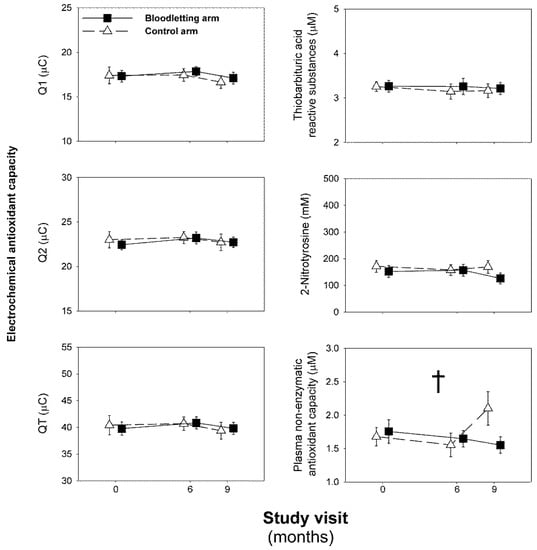 To address the effect of bloodletting on oxidative stress markers at each visit, we implemented a repeated-measures general linear model (GLM) including the arm of treatment as the between-subjects effect and the visit (months 0, 6, and 9) as the within-subjects effect. A statistically significant interaction of the between- and within-effects would indicate that the changes were different depending on the arm of treatment. We used Mauchly’s test to measure sphericity, and then applied Greenhouse–Geisser epsilon adjustment as needed. In pairwise comparisons, we dealt with multiplicity by adjusting CI using Bonferroni’s method. We also explored the changes in oxidative stress biomarkers throughout the RCT as areas under the curve (AUC) were determined using the trapezoidal rule. We compared the resulting AUC in each arm of treatment by unpaired t-tests.