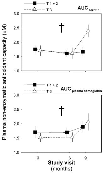 Changes in plasma non-enzymatic antioxidant activity throughout the experimental phase of the trial as a function of the changes in plasma ferritin and hemoglobin grouped by tertiles. We show data as means (SEM) of the patients remaining at each visit of the trial even though we conducted intention-to-treat statistical analyses. Data were submitted to a repeated-measures general linear model introducing the upper tertile (T3) vs. mid and lower tertiles (T1 + 2) as between-subjects factors. † Statistically significant interaction between the visits and tertile subgroups.