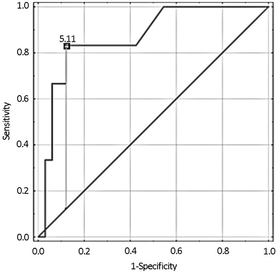 The best cut-off point was determined using the highest Youden’s index that yielded optimal balance between sensitivity and specificity. Therefore, the highest Youden’s index of 0.71 was observed for a cut-off value of 5.1 mmol/L, resulting in 83.3% sensitivity and 87.9% specificity, suggesting that the choice of 5.0 mmol/L as a criterion for hyperkalemia was, in this case, justified. The area under the ROC curve for all-cause deaths was 0.87 (95% CI = 0.72–1.00, p < 0.001).