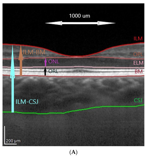 Spectral-domain OCT was carried out with a Spectralis HRA + OCT imaging device with eye tracking (Heidelberg Engineering, Heidelberg, Germany). The protocol of the OCT imaging comprised of 25 horizontal raster scans (20 × 20°) and a linear B-scan centered at the fovea. The segmentation of the retinal layers was carried out automatically with the Spectralis software (version 6.7, Heidelberg Engineering, Heidelberg, Germany), as shown in Figure 1. The internal limiting membrane (ILM), outer plexiform layer (OPL), external limiting membrane (ELM), and Bruch’s membrane (BM) were detected automatically, and the choroidal–scleral junction was marked manually on each scan by shifting the BM line to the choroidal–scleral junction, as described previously [46]. Manual measurements were reviewed by the authors, and disagreements were resolved through discussion.