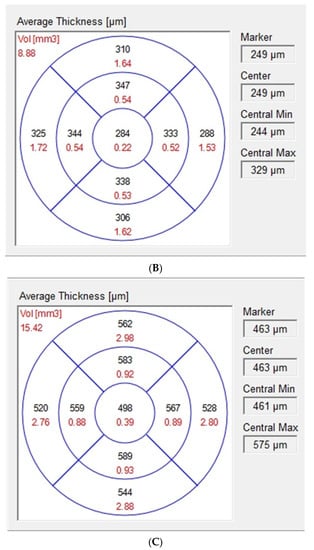 Based on ETDRS macular maps the values of choroidal parameters were obtained by subtracting retinal parameters (calculated automatically from the ILM to the BM, Figure 1A,B) from total parameters (calculated automatically from the ILM to the manually marked choroidal–scleral junction, Figure 1C). The fovea was checked and, if necessary, manually replotted. The outer retina was defined as the ONL and the ORL sum. The ONL and the ORL were defined according to the Heidelberg Spectralis HRA-OCT software, with the ONL as an area between the outer border of the OPL and the ELM and the outer retinal layer (ORL) as an area between the ELM and the BM (Figure 1A). The choroid was defined as an area between the BM and the choroidal–scleral junction.