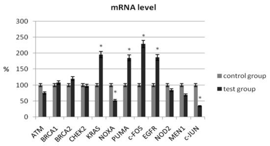 In our study, we determined the expression of selected suppressor genes (ATM, BRCA1, BRCA2), proto-oncogenes (KRAS, c-JUN, c-FOS), pro-apoptotic genes (NOXA, PUMA), genes related to chromatin remodeling (MEN1), and genes related to carcinogenesis (NOD2, CHEK2, EGFR) using the real-time PCR method. The analysis of the mRNA level of the ATM gene did not show a significant change in its expression in patients with ovarian cancer compared with the control group (75.45% ± 5.56 vs. 100% ± 4.26; p > 0.05) (Table 3). As shown in Figure 1, no significant changes in transcriptional levels were observed for BRCA1, BRCA2, NOD2, or CHEK2. In patients with ovarian cancer, the mRNA level of MEN1 and ATM1 was reduced by 31% (p > 0.05) and 25% (p > 0.05), respectively.