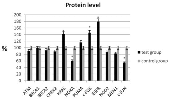 Analysis of the protein level for ATM, BRCA1, BRCA2, KRAS, c-JUN, c-FOS, NOXA, PUMA, MEN1, NOD2, CHEK2, and EGFR in the tissue homogenates in patients with ovarian cancer in comparison to the control group.