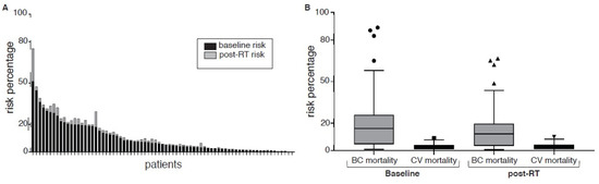(A) Baseline and post-RT 10-year major cardiovascular event risk. (B) Baseline and post-RT 10-year breast cancer and cardiovascular risk mortality. Circles show baselines values, triangles are post-RT.