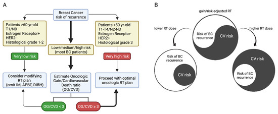 Evidently, the elaboration of tailored or personalized RT plans is a complex process that demands the evaluation of several factors. Figure 2A shows a diagram that summarizes our proposal. Initially, patients are divided according to their relative risk of BC recurrence. A small subset is categorized as having a very low risk of recurrence (Figure 2A, left), including patients >60 years old, with T1/N0 cancer, with estrogen receptor (ER)+, with HER2-, and with a low histological grade. For these patients, we propose considering modifications in the RT plan to reduce CV risk. This can be achieved by modifying the target volume, for example, by using partial breast RT, controlling the respiratory cycle to treat the patient in a deep-breath hold, or modifying the position, such as using the prone position for large-breast patients or applying a different technique utilizing modern VMAT, IMRT, or photon-RT at certain specialized cancer centers. Conversely, a proportion of patients are categorized as having a very high risk of recurrence, including patients <60 years old, with T1-T4/N2-N3 cancer, with ER-, with HER2+, and with a high histological grade (Figure 2A, right). For these patients, we propose proceeding with the optimal oncological RT plan. Lastly, most BC patients fall into the category of “low–medium–high” risk of recurrence (Figure 2A, center). In this group, we propose an estimation of the oncological gain versus the CV death (OG/CVD) ratio. As shown in the diagram in Figure 2A, we postulate a cutoff value of OG/CVD = 3 to discriminate between optimal oncological RT (OG/CVD ≥ 3) or reconsideration/modification of the RT plan (OG/CVD < 3). In summary, a gain/risk-adjusted and tailored RT plan should balance the BC recurrence risk and the CV risk of patients, given that lower or higher RT doses can increase the BC recurrence risk or the CV risk.