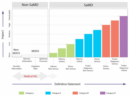 Risk-based approach to evaluate and categorize software designed for medical purposes. Category I-IV reflects an impact on patients being associated with medical utilization (inform, drive, treat, diagnose) and clinical scenarios that the service is intended for (non-serious, serious, critical). Non-MDDS—Non-Medical Device Data Systems; MDDS—Medical Device Data Systems; SaMD—Software as a Medical Device.