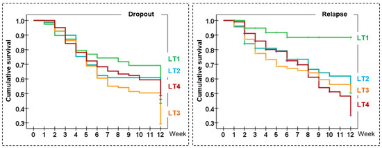Kaplan–Meier functions for the incidence rate of dropout and relapse. Note. LT: latent class; LT1: good progression to recovery; LT2: middle progression; LT3: bad progression to dropout; LT4: bad progression to relapse.