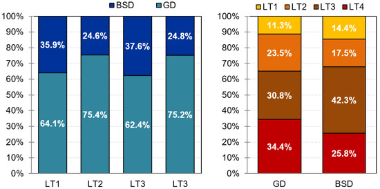 Distribution of the diagnostic subtype within each latent class. Note. BSD: buying/shopping disorder; GD: gambling disorder; LT: latent class; LT1: good progression to recovery; LT2: middle progression; LT3: bad progression to dropout; LT4: bad progression to relapse.