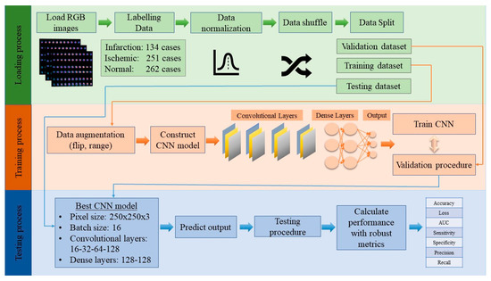 The aim of this research is the development of an efficient CNN that can fully autonomously identify any signs of cardiovascular disease. With the utilization of accurate metrics along with external evaluation and more specifically, 10-fold cross-validation the CNN model will be tested for its accuracy and robustness. Throughout the CNN exploration process, experiments were conducted with various values for the following parameters: pixel size, batch size, number of nodes and layers of convolutional layers, and number of nodes of fully connected layers [27]. The proposed structure for the corresponding dataset is illustrated in Figure 3 and includes four convolutional layers, followed by one pooling layer and one dropout layer, whereas two fully connected layers follow which both have 128 nodes, providing three outputs: infarction, ischemic, and normal. Regarding the activation function of the output layer, we used softmax, because it is suitable for multi-class classification problems [27].