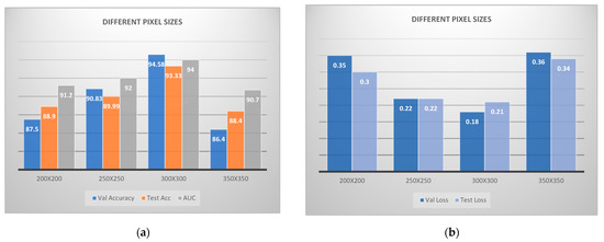 Afterwards, we examined different pixel sizes, while having kept fixed values for convolutional and dense layers, considering that 32 is the best batch size. In Figure 4, we can clearly distinguish, the remarkable results that 300 × 300 extracted, in contrast to the rest structures, thus being the best combination for our corresponding dataset.