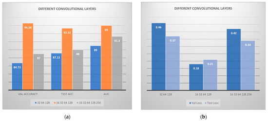 In the following step, different convolutional layers were examined, in order to configure to the best combination. In Figure 5 the calculated results are visually illustrated regarding the application of various convolutional layers. The combination of 16-32-64-128 convolutional layers seems to have performed better, in terms of overall metrics. On the other hand, the combination 32-64-128 and 16-32-64-128-256 did not perform sufficiently. Moreover, we have performed further experiments with various epochs, in the range between 400 and 800. However, we observed that above 400 epochs, no improvement in results was attained.