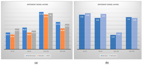 The last step deals with the selection of the best number of nodes for the dense layers. Therefore, different numbers of nodes were examined, and the produced results are visually depicted in Figure 6. It is concluded that the best sequence is 128-128, where all metrics are considered.