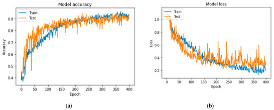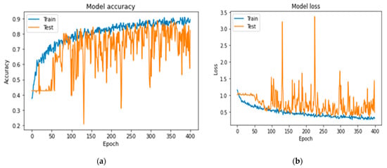 Plots demonstrating the best RGB-CNN for the CAD classification problem: (a) accuracy; (b) loss.