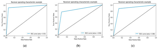 Performance of Receive Operating Characteristic (ROC) curve for proposed RGB: (a) infarction; (b) ischemia; (c) normal.