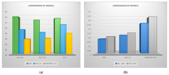 In Figure 13, the comparison of RGB-CNN, VGG-16, and DenseNet-121 is illustrated with respect to the produced validation and testing accuracy, AUC, and validation and testing loss results for each model. It is observed that RGB extracted the best results, for the case where VGG-16 has similar results in validation and testing loss. DenseNet-121 performed adequately.