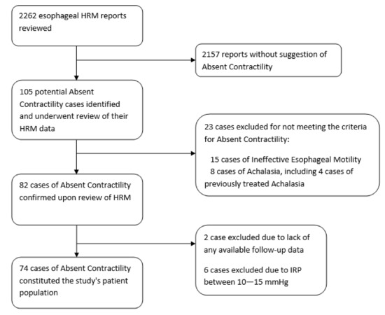 Manometry reports of adult patients (18 years of age and older) who underwent esophageal HRM between 2007 and 2021 were retrospectively reviewed for potential cases of AC. As some of these HRM studies were performed before the term AC was coined, the manometry reports were reviewed for several different keywords suggesting possible AC: scleroderma esophagus, scleroderma-like esophagus, absent peristalsis, absent contractility, hypocontractile esophagus, and hypotensive lower esophageal sphincter (LES).
