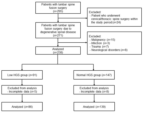 The study protocol followed the principles of the Declaration of Helsinki and was approved by the Institutional Review Board (no. 4-2021-1598). The requirement for obtaining informed consent from the patients was waived due to the retrospective design of this study. This manuscript adheres to the applicable STROBE guidelines (Supplementary Materials) for observational studies [14]. Patients aged between 20 and 85 years who underwent elective posterior lumbar interbody fusion surgery between November 2016 and March 2018 at a tertiary university hospital were enrolled. In this study, indications for lumbar fusion surgery included the following: spinal stenosis, degenerative spondylolisthesis, herniated intervertebral disc disease, spinal instability, and degenerative scoliosis confirmed by imaging studies. Conservative management was performed for at least 3 months, and surgery was performed if symptoms did not improve. Patients who were able to measure grip strength and had normal cognitive function without diagnosed neurodegenerative disease or psychiatric disorders at the pre-anesthetic visit were included. Patients with a malignancy, an infectious disease, a congenital disease such as cerebral palsy, or trauma, as well as those who underwent multiple lumbar surgeries within the study period, were excluded. Patients with hand osteoarthritis or a neurological disorder that could affect HGS, such as motor neuron disease and Parkinson disease, were excluded.