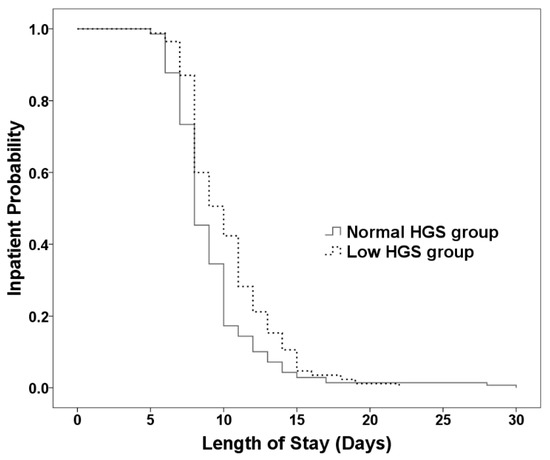 Predictive factors among the demographics and perioperative clinical variables for longer LOS (≥10 days) after surgery were identified using univariate and multivariate analyses (Table 4). Among the preoperative factors, low HGS according to the 2019 AWGS guideline (aOR = 1.917, 95% CI = 1.046–3.513, p = 0.035) and lower hemoglobin level (aOR = 0.733, 95% CI = 0.598–0.898, p = 0.003) were independent predictors for longer LOS after surgery in multivariate analysis. In addition, multilevel fused (aOR = 2.681, 95% CI = 1.412–5.087, p = 0.003) and longer duration of surgery (aOR = 1.561, 95% CI = 1.103–2.210, p = 0.012) were significantly associated with longer LOS in this population. However, female, DM, lumbar surgery history, ASM, intraoperative blood loss and transfusion, postoperative hemoglobin, transfusion, and complications were not associated with longer LOS after controlling for other variables. The Kaplan−Meier curves for inpatient probability of the low and normal HGS groups are illustrated in Figure 2. The median LOS was significantly longer for patients with low HGS than for those with normal HGS before surgery (10 days [95% CI = 8.809–11.191] vs. 8 days [95% CI = 7.574–8.426], log-rank p = 0.006).