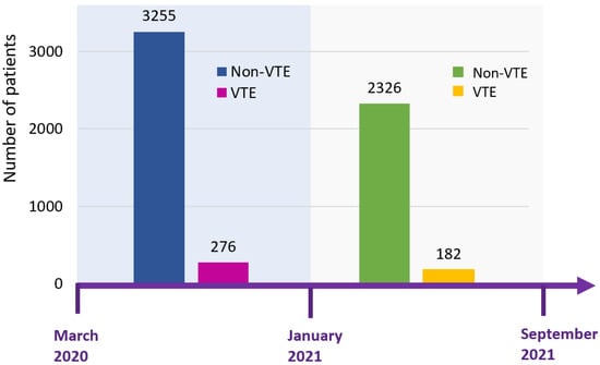 - Vaughn, V.M.; Yost, M.; Abshire, C.; Flanders, S.A.; Paje, D.; Grant, P.; Kaatz, S.; Kim, T.; Barnes, G.D. Trends in Venous Thromboembolism Anticoagulation in Patients Hospitalized with COVID-19. JAMA Netw. Open 2021, 4, e2111788. [Google Scholar] [CrossRef] [PubMed]