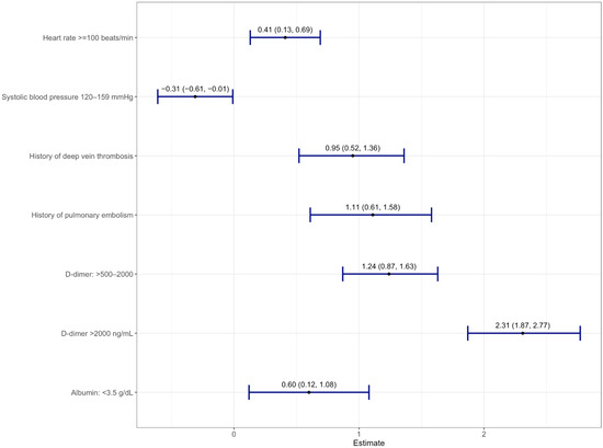 Forest plot of multivariable logistic regression showing seven variables with log-odds along with a 95% confidence interval from derivation cohort predictive of acute venous thromboembolism.