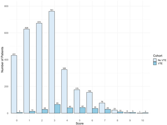 Histogram of risk assessment model score of venous thromboembolism (VTE) and non-VTE groups. The median score is 4 and 2 for VTE and non-VTE group, respectively. Overall, 49.7% scored below 3, whereas 50.4% of VTE patients scored 3 and above.