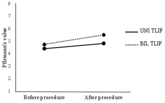Patients with available MRI data before and after surgery were included in the next analysis (Figure 2). A comparison has been made between the Pfirrmann grades before and after the surgical procedure in the same patients (Table 2). Pfirrmann grades after the UNI TLIF procedure were 9.28% higher than before the operation. The same grades after the BIL TLIF procedure were 16.74% higher compared with grades before the surgical procedure.