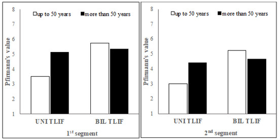 The following analysis considering age shows patients who underwent UNI TLIF surgery who were aged between 32 and 84 at the time of surgery, on average 62.84 years (SD = 12.536) (Table 3). The patients who underwent BIL TLIF surgery were aged between 38 and 85 at the time of surgery, on average 60.67 years (SD = 11.894). The assessment of the intervertebral disc structure is on average lower in patients aged less than 50 years at the time of surgery compared with those who were aged more than 50 years in the UNI TLIF group, and on average higher in the BIL TLIF surgery group for both the first and the second segment (Figure 3).