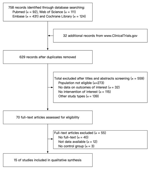 A systematic search was conducted using electronic databases of Medline (PubMed), Embase, Web of Science, Cochrane Library Central Register of Controlled Trials (CENTRAL), and www.ClinicalTrials.gov, from inception to 1 February 2022. The language was limited to English. The search procedures and strategies are shown in Supplementary Table S2. Eligible studies met the following criteria:
