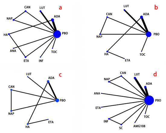 Network plot. (a), pain; (b), physical function; (c), stiffness; (d), adverse events; PBO, placebo; ADA, adalimumab; LUT, lutikizumab (ABT981); CAN, canakinumab; NAP, naproxen; HA, hyaluronic acid; ANA, anakinra; ETA, etanercept; INF, infliximab; SC, standard care; TOC, tocilizumab. The size of the circle represents the number of participants, and the thickness of the line represents the number of studies.